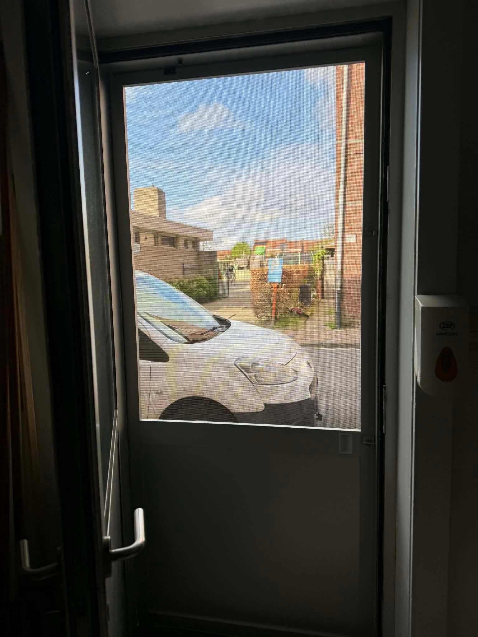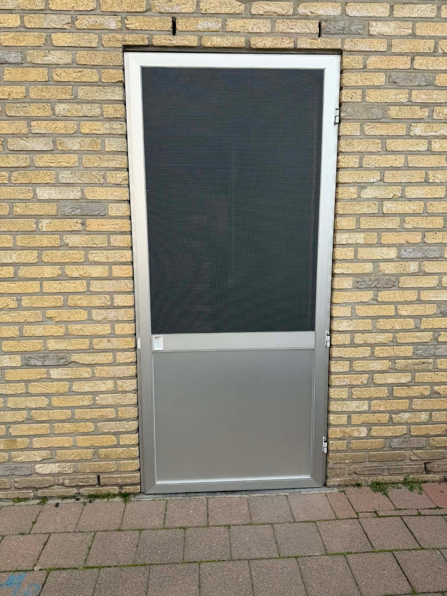 De klant koos voor een stevig petscreen bovenaan - ideaal voor huisdieren - en een stijlvol vast paneel onderaan in RAL kleur zoals hun deur.