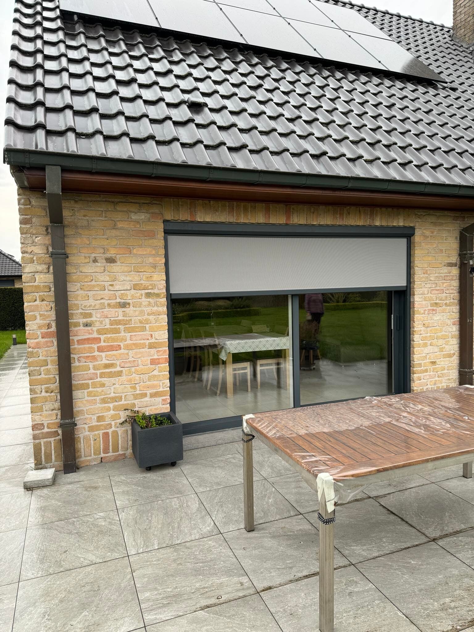 Het rolluik wordt eenvoudig bediend met een handige wandzender. Bovendien werd het rolluik perfect afgestemd op de ramen: met een stijlvolle zwarte kast en bijpassende zwarte lamellen.