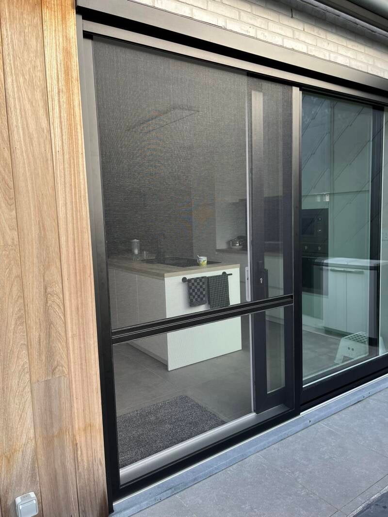 Deze klant koos voor een dubbele schuifhordeur voorzien van zwart petscreen en een kattenluikje.